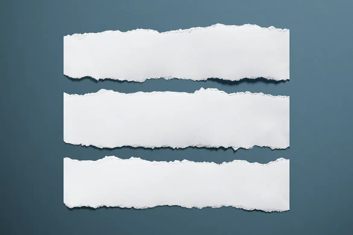 مجموعه‌ای از ۱۲ تکه کاغذ پاره‌شده با وضوح بالا و پس‌زمینه شفاف، با سایه‌های واقع‌گرایانه و قابلیت تغییر رنگ یا افزودن متن یا تصویر، همه در یک فایل PSD. تمام تصاویر با استفاده از دوربین Canon 5D Mark II ثبت شده و سپس روتوش و جداسازی شده‌اند. سایه‌ها در لایه‌های جداگانه قرار دارند و شما می‌توانید رنگ، نوردهی، سایه‌ها و اندازه‌ها را تغییر دهید.
